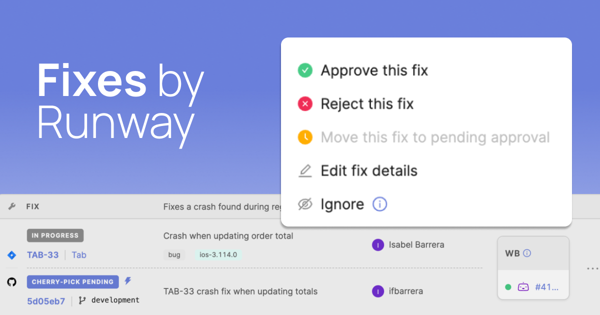 Fixes by Runway provides mobile teams with a safer and more consistent way to get late-arriving changes into a release when needed. It applies real guardrails that allow teams to track, review, and approve any late additions, while automating away the busywork and context-switching required to actually get changes pulled in.